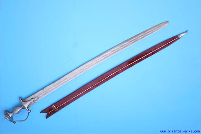 This is a rare cousin of the Tulwar, the famous Indian sword / saber. It is known as Kirash or Karash and it is characterized by the slightly down curving blade with the edge on the concave side and the down curving spine with a false edge. This one is a very good exemplar with a unique blade double fullered with a curling pattern of the fullers and showing a wootz structure. Blade length 30 inches. False edge 8 1/2 inches. The blade also shows a welding pattern known as Scarff welding about 9 inches below the handle. The hilt is typical whole steel Tulwar style. Original fabric covered scabbard with silver tip (recent). Total length 36 inches. Very Good condition. Minor forging flaws on the blade. |
