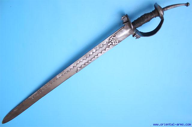 Up for sale is this very good Khanda sword, 17-18 C., with a 29 inches blade. The blade is reinforced with long decorative steel strips on the spine and on part of the edge. The basket shape handle is classical Indian, with a 3 inches pommel spike. Total length 36 nches. Very good condition to age. The original grip cover is lightly damaged and with a repaired binding. No scabbard. |