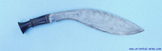 The KHUKURI is the traditional weapon of the Gurkha people from NEPAL. It is an every day tool used for hunting, agriculture, defense and fighting, and every man in Nepal is proud to carry one for use and as a symbol of status. It derives its shape from the “KOPIS” the ancient Greek sword. This example is known as Budhume. The blade is 12 inches long, and well forged with scroll design engraved near the spine. The hilt is carved of black horn. Very good condition. No scabbard. Original and authentic piece at a very attractive price. |