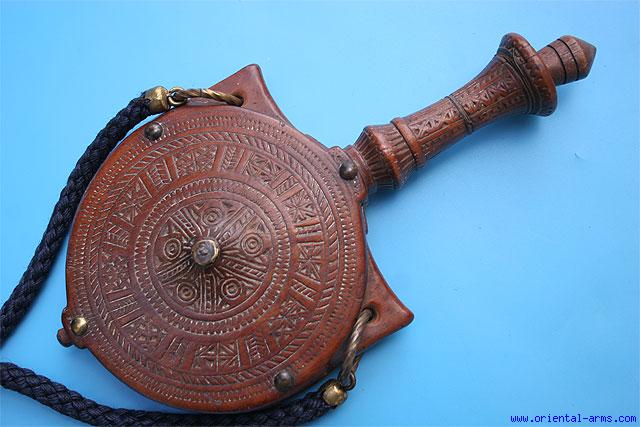 This fine powder flask is coming from Algeria, late 19 to early 20 C. Finely carved wood with brass tacks and wooden top plug. Diameter 5 1/2 inches, height 11 inches. Very good condition. Old repair to the flask mouth. The carving on the flask is very similar to the carving on scabbards of Flyssa swords and other wood works from the area. |