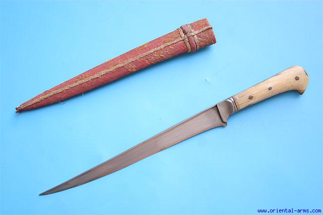 This small Karud knife is from India, mid to late 19 C. The blade is 7 1/2 inches long with a pronounced T spine. Steel bolsters and grip strap and bone grips. Wood scabbard covered with fabric. Total length 12 inches. Very good condition. The right grip is cracked and repaired. |