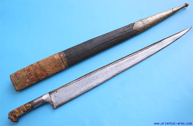 This is a classical example of the famous Khyber sword coming from Afghanistan. The heavy massive blade is 23 inches long, 2 inches wide with a pronounced T spine. The bolsters and grips straps are steel. The grips are ribbed horn with good age patina, Original scabbard covered with tooled leather and finely engraved brass chape. The upper part is bound with somewhat later but still old and original colorful fabric strip. Total length 32 1/2 inches. Very good plus condition. Minor losses to the left grip. Like in the classical swords of this type, the blade goes all the way into the scabbard and only the upper part of the handle is exposed. Very impressive sword. |
