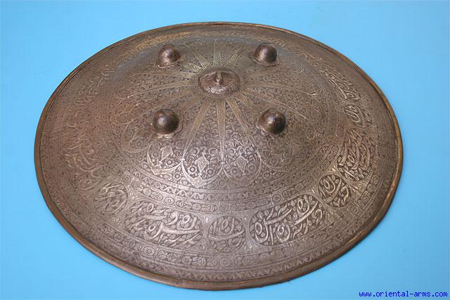 This very good shield is Persian, Qajar period, mid 19 C. 19 inches diameter, heavy steel finely chiseled with floral design and inscription in Arabic letters. A star and a chiseled human face in the center. The shield is decorated with silver and gold koftgari inlay. The shield is set with four bosses and mounted with a brass strip around the rim. Original red fabric inner cover. Very good condition. Losses to the koftgari inlay. Hand cushion , handles and mounting rings are missing. |