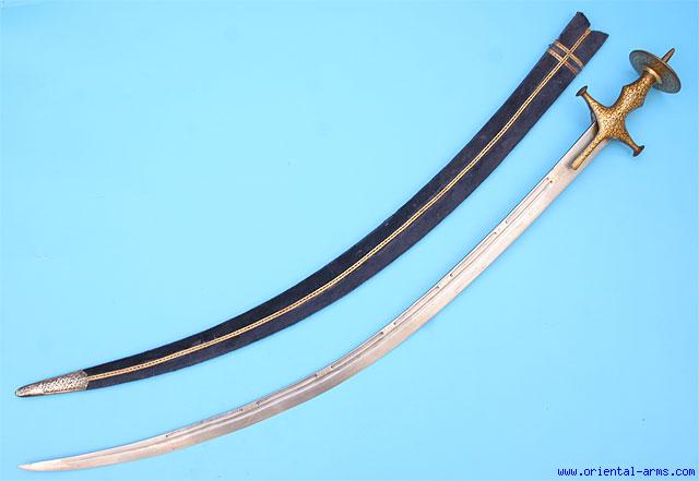 This fine Shamshir sword is Indian, 19 C. with an 18 C. Blade dated 1212 (1797 in the Gregorian calendar). The blade is 32 inches long, single edged, marked with a gold inlaid Arabic inscription and the date 1212. The fullers are separated to several sectors with gold inlay decoration in between. Classical Tulwar style handle richly decorated with fine gold koftgari work all around. Original scabbard covered with blue velvet (recent) and mounted with a silver chape. Total length 39 inches. Very Good condition. Minor forging flaws on the blade. |