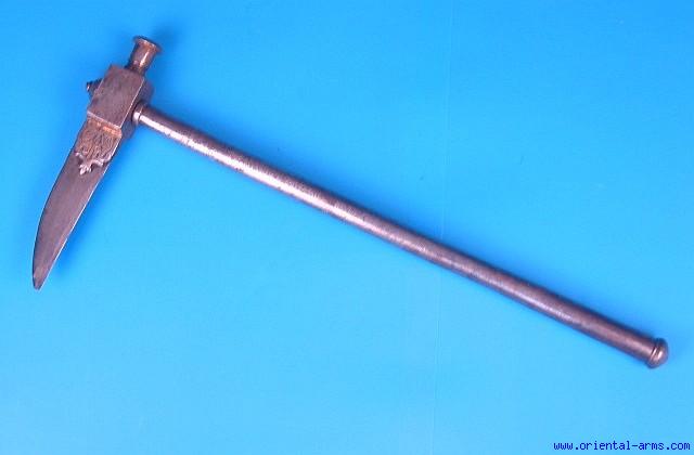 We offer for sale this beautiful, unusual and rare Indian war hammer. A whole steel haft, 18 ½ inches long ending with a steel block, 8 inches blade on one side and a hammer head on the other. Traces of gold koftgari decorations. Very Good condition with a very slight bent on the shaft. Unusual and attractive item. |