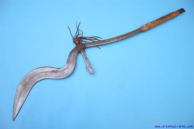 This type of Throwing knife is coming from the south east regions of present Sudan. Most probably used by the Ingessana tribes, although found in neighboring tribes. This one is an early 20 C. item, very well made and nicely decorated. The upper S re-curving blade is 12 inches long. The side cross bar is 4 inches long. |The long handle is covered with hide and the base of the blade and the cross bar is bound with braided leather strips bound by heavy thick brass wire. The entire length of the knife is engraved with geometrical style decoration. Total length 28 inches. Very good condition. Minor damage to the braided leather strips. A rare version of the African throwing knife. |
