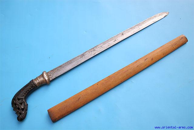 This Parang sword has an unusual blade. Heavy with a downcurving tip, forged from fine pamor along the spine. Finely carved horn handle with silver collar. Plain wood scabbard (may be later). Blade length 25 inches. Very good condition