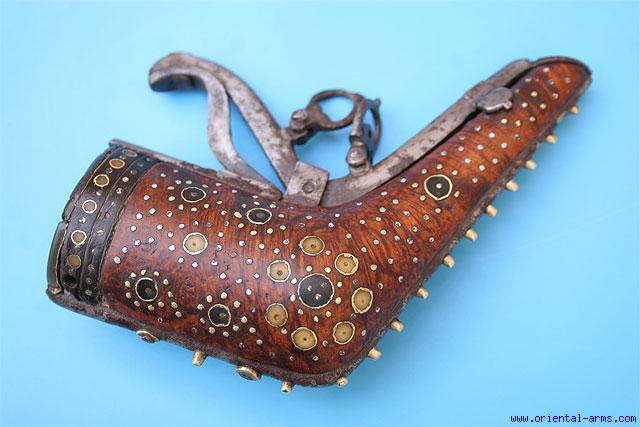 Up for sale is this rare and early powder flask, Persia, most probably early to mid 18 C. made from a piece of grained hardwood set with many brass, bone and steel inserts. Steel spring and fittings. Horn top cover. Total length 5 1/2 inches. Very good condition. Few inserts are missing. The top horn cover is damaged and repaired. |