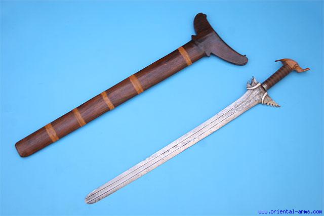 This Kris is an early version, probably late 18 to early 19 C. The fine blade is straight, 20 1/2 inches long with two narrow fullers running to the very tip of the blade (yet we do not think the blade is shortened or re shaped). The upper part is finely engraved and inlaid with silver wires. Two steel clamps are reinforcing the blade in the handle. The grip is covered with fiber. Ivory Cockatoo style pommel. Wood scabbard (Later, and may be not made for this blade). total length 28 inches. Very good condition. Minor blackened spots on the blade. Fine age patina on the pommel. A rare form. |