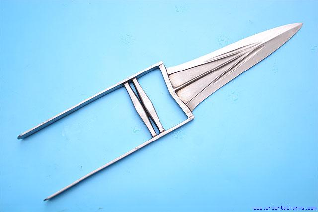 This fine armor piercing Kattar dagger is coming from India, most probably Rajhastan, late 18 to early 19 C. The Wootz (Damascus) blade is finely forged, 8 inches long, nicely fullered with an thickened armor piercing tip. As common in such high quality Kattars, only the fullers areas are etched to reveal the steel pattern whereas the edges are left highly polished. Handle length 7 1/2 inches 3 1/4 inches wide. Total 15 1/2 inches. Very good condition. Minor edge nicks. The simple, clean lines and top quality steel are characteristic to good Rajhastani blades. A Katter made for real work and not for show up only. |
