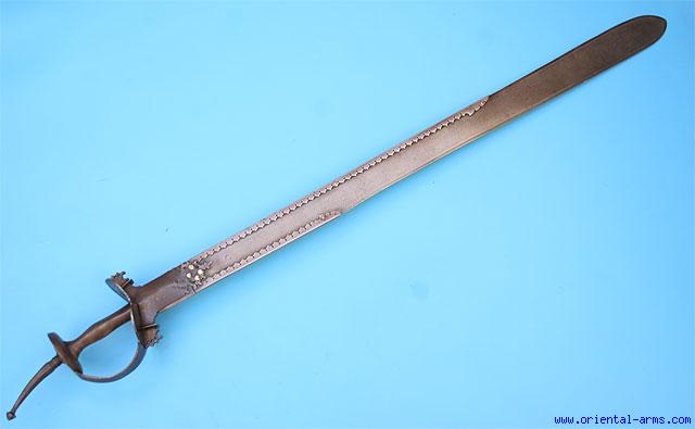 Up for sale is this fine Khanda sword, late 18 C., with a 30 inches blade forged of very fine high contrast wootz (watered, Damascus) steel. The blade is widening to its maximum width of 2 inches just above the tip, which is rounded in a spatula shape. Swords with this form of blade is some time called Patissa. and a shorter one on the edge. The basket shape handle is classical Indian with traces of gold koftgari decoration, ending with a 3 1/2 inches pommel spike. Total length 37 inches. Very good condition. No scabbard. A fine rare sword.