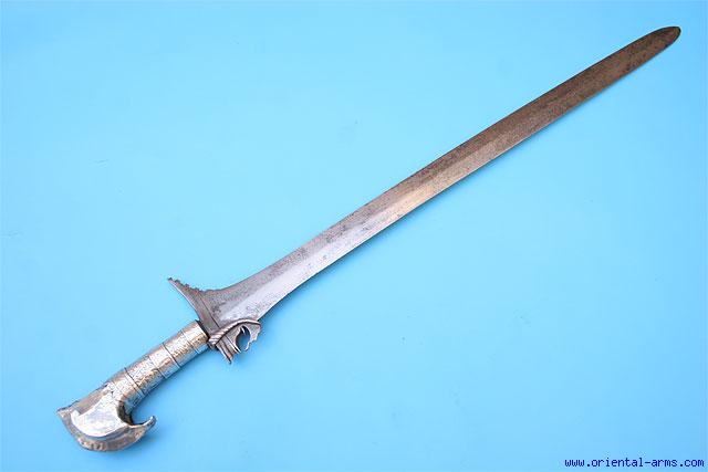 Up for sale is this very good Moro Kris sword, late 19 C. Finely forged blade, most probably of laminated steel, 22 inches long. Grip covered with engraved silver as well as the Cockatoo style pommel. One decorated silver clamp reinforce the blade to the handle. Total 27 inches. Very good condition. Minor dents on the silver work.