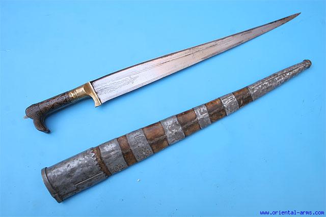 This short sword is a version of the Khyber sword from Afghanistan. Classical blade shape, 17 inches long with a pronounced T spine. Unusual horn grip shape with lobbed pommel, decorated with steel nails. Brass bolsters and grip strap. Scabbard covered with chased Aluminum bands. Total length 22 1/2 inches. Very good condition. |