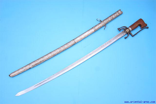 Up for sale is this Nimcha sword from Morocco, employing a fine heavy finely fullered blade, 34 inches long, most probably of European origin with a clear maker stamp. The handle is carved from a massive piece of rhino horn with clear fibrous structure set with engraved silver collar. The hilt guard and down curving quillons are inlayed with gold. The scabbard is heavy silver engraved in a classical Moroccan style. Total length 41 inches. A fine piece of quality in very good condition. |