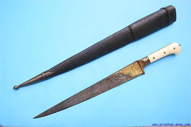 This fine short sword has a classical shape blade 14 inches long with pronounced T spine. The blade is forged from fine Wootz (Damacus, Watered) steel of dark high contrast pattern and richly decorated with gold koftgari work on the blade base. Steel bolsters and grip strap also richly inlaid with gold. Elephant ivory grips set with green stones. Original leather covered scabbard with faceted steel tip. Total length 22 inches. Very good condition. Darkened areas on the blade (but not pitted). Very minor losses to the gold decoration. |