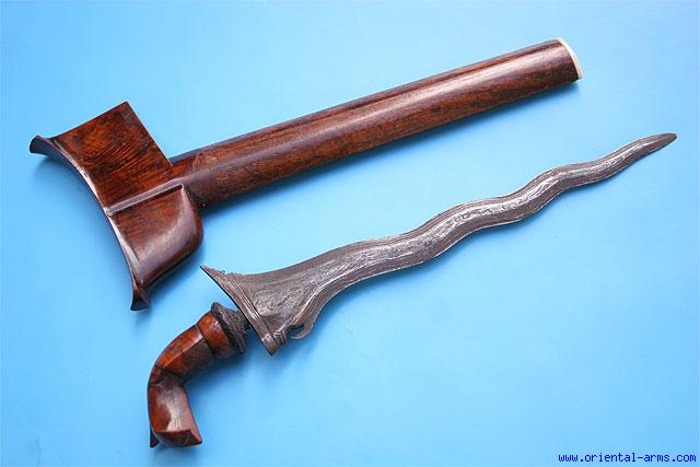 This Bugis Keris Dagger has a wavy blade 12 inches long, with clear pamor structure. The mendak is engraved brass. The hilt and the scabbard are finely carved from a beautifully grained wood, in a classical Sulawezi style. Bone scabbard tip. Total Length 16 1/2 inches. Very good condition. |