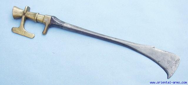 This type of weapon is very unusual and I hesitate to call it a sword. It is coming from the Assam area in North-East India and it is a common side area to various tribes of the Naga people residing in this area. A very similar item is drawn in: P. S. Rawson, The Indian Sword fig 46, related to the Kuki tribes. The blade is down curving, 12 ½ inches long and the handle is cast brass. Total length 16 ½ inches. Good condition. The hair tuft on the pommel is missing.