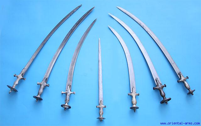 Swords for boys and / or youngsters were made in India and always included all details of full size swords. Up for sale is this rare, interesting and very good collection including 7 swords made for boys. All Indian, late 18 to mid 19 C. Blades are 15 to 22 inches long. Total length 18 to 26 inches. One sword has a wootz blade and two others has laminated blades. The handles are all miniaturized full scale handles. Three of the handles are of high quality inlaid with silver and gold, the others are steel with traces of silver plating. The handle of the central sword with the straight blade is silver plated copper. Three of the swords has their original scabbards with fabric cover (not shown). Very good condition with very minor nicks and damages on few blades. A rare collection. |