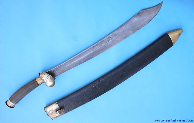 This is a very interesting short sword from Indonesia. It was made in the village of TJIKOREH (CHIKOREA in the modern Indonesian spelling), famous in the production of edged weapons of various shapes. Many blades were done as a special order for foreigners, mainly Dutch people residing in Indonesia. This one here is an excellent example of a mix of Indonesian and western styles. The blade is short and heavy, 14 inches long, with a pronounced clipped tip. It is very finely engraved and engraved TJIKR (most probably standing for TJIKOREH). The horn grip with its brass shell type cross guard and mounts are styled in the shape of a European hunting sword. Black painted wood scabbard with brass mounts. Total length 22 inches. Very good condition. Minor edge nicks.