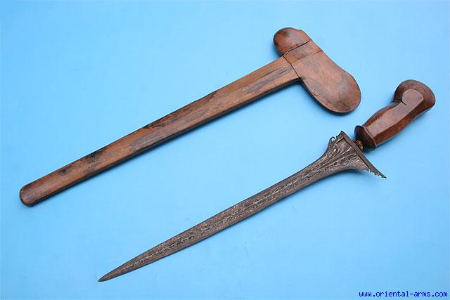This Keris dagger is coming from Bali, Indonesia, late 19 to early 20 C. Straight blade 16 inches long of very good clear and polished pamor structure. Big grained wood handle. Silver mendak set with gem stones (one missing). Finely grained wood scabbard. Total length 26 inches. Very good condition. Very attractive sword.