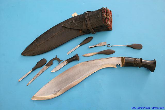 An interesting, early 20 C. khukuri Knife / Dagger from Nepal that comes with seven accessories: Small knives ( Kardas) and other small implements. These type of Khukuri were used by villages handymen to perform all kind of small repair jobs (some say that medical treatment as well). Well forged blade with ridged spine 12 inches long with brass bolster. Good, decorated original leather scabbard with many pockets for all accessories. Very good plus condition. Few accessories are missing. |