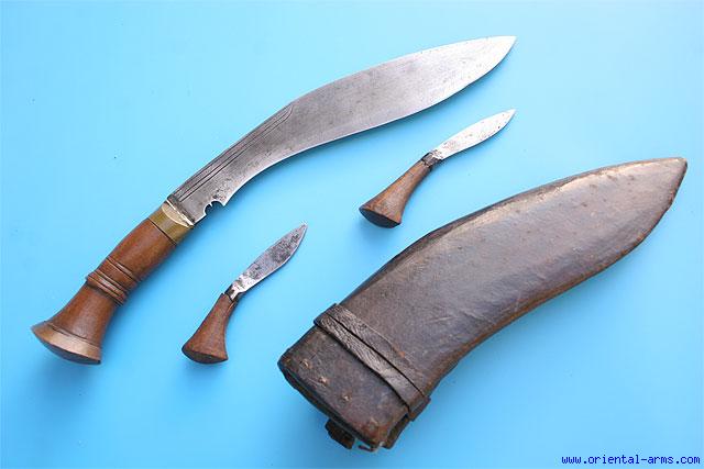 This one looks simple but it is a real one made for work, early to mid 20 C. Good blade with ridged spine, 10 inches long. Wood grip with brass bolster and pommel cap. Leather scabbard with the original and classical two small accessories: Karda and Chakma . Total length 14 1/2 inches. Very good condition. Very low price.