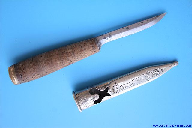 Up for sale is this small knife, most probably from sweden, early to mid 20 C. 3 1/2 inches narrow blade. Grip is composed of dense cork disks with brass pommel. White metal scabbard. Total length 8 inches. Very good condition.
