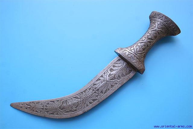 Up for sale is this Jambiya dagger, from India, late 19 C. Blade 9 inches with a flat diamond cross section chiseled with a tiger hunting an antelope on a floral background. whole steel handle chiseled in the sam style. Total length 13 inches. Very good condition. Very low price. |