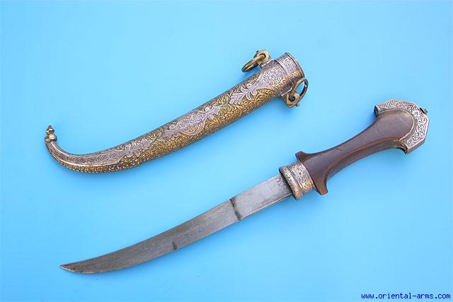 The Moroccan version of the Arab Jambiya dagger is locally called Koumaya and characterized by a slender blade, usually dual edged at its lower half and single edge at the top. There is a big variety in the decoration styles and quality of the handles and scabbards. This one is a very good classical example, circa 1900, of a very good quality, with a 9 inches blade, finely chiseled brass scabbard with engraved silver panels on its front side. The hilt of carved wood with chased and engraved brass / silver mounts. Total length 16 inches. Very good plus condition. Good age patina on the wood grip. |