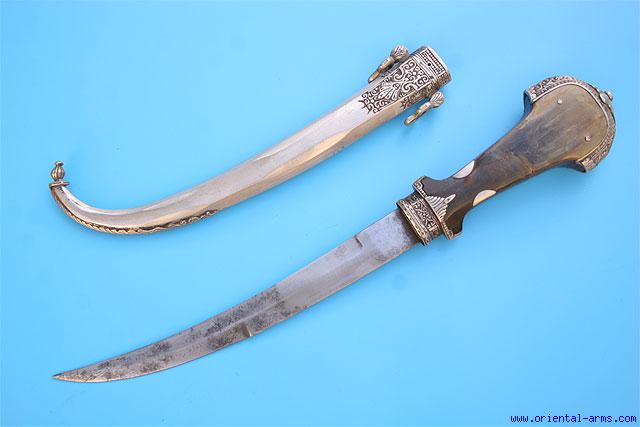 The Moroccan version of the Arab Jambiya dagger is locally called Koumaya and characterized by a slender blade, usually dual edged at its lower half and single edge at the top. There is a big variety in the decoration styles and quality of the handles and scabbards. This one is a fine example, circa 1920, of a very good quality. 9 1/2 inches blade of good quality. Massive horn grip with chiseled silver mounts and heavy silver scabbard finely chiseled at the top. Total length 16 inches. Very good condition. Minor pitted spots on the blade. A very elegant piece. |