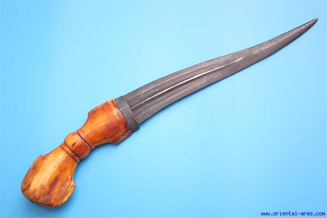 Up for sale is this very early and rare form of Indian Dagger, from a class of daggers known as Chillanum . Daggers in this class may take various shapes. This one is probably late 17 to early 18 C., with heavy re-curving blade 10 ½ inches long with a central rib and shallow fullers. A massive ivory handle with a steel collar, probably cut from an hippopotamus tusk. Total length l6 1/2 inches. Very good condition to age. Well patinated blade and fine deep color shining age patina on the handle. The steel collar is a later addition. Impressive item. |