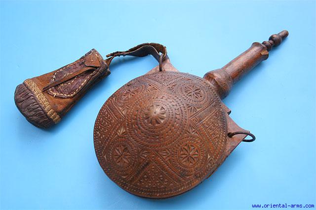 This powder flask is coming from Algeria, late 19 to early 20 C. Finely carved wood 5 inches diameter 9 1/2 inches height. This flask comes with its original wood plug and original leather pouch for bullets. Very good condition. Minor chip on the flask mouth. The carving on the flask is very similar to the carving on scabbards of Flyssa swords and other wood works from the area. |