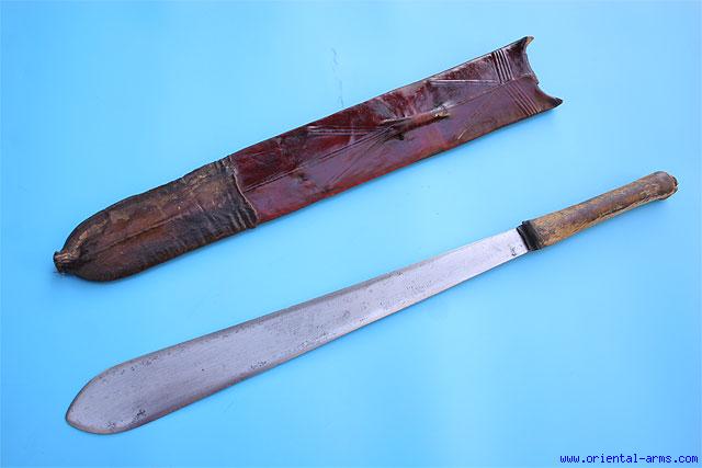 This Seme, the classical sword of the Massai people of East Africa has a very interesting British made blade, marked and signed CHPPA, 2071, S.H&BLANKS LTD, SHEFFIELD . Blade 16 inches long widening to 2 inches toward the tip. Hide covered handle and red dyed hide scabbard. Total length (in scabbard) 23 inches. Very good condition. |