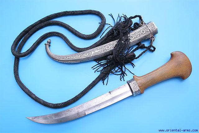 Up for sale is this fine and Koumaya Dagger from Morocco. Classical blade of very good quality, 9 inches long, double edged at its lower half and single edged at the top. The handle is carved from a single massive piece of Rhino horn with a very clear fibrous structure. Heavy silver scabbard, chiseled with classical Moroccan floral design with engraved inscription in Arabic letters on the back. Total length 15 1/2 inches. Very good condition. This Koumaya comes with its original black cotton baldric carrying rope. |