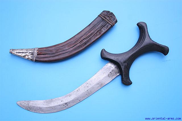 The Beja daggers with the big X shaped handle, sometimes known as Hadendoa or Beni Amer comes from the West South shores of the red sea. This one is a classical example with an 8 inches blade, K shaped blackwood handle and leather sheath with a silver tip. Total length 13 inches. Very good condition. The scabbard mouth is reinforced with copper wire. |