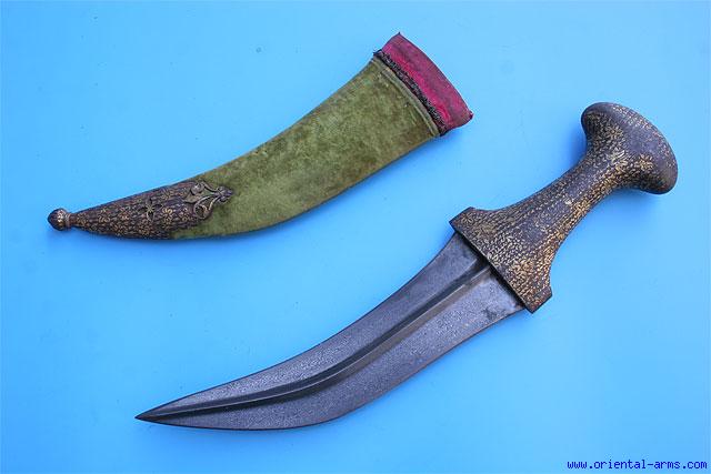 This dagger is Indian, early to mid 19 C. The classification as Indo-Arab is derived from the general shape and size which are much influenced by similar Arab daggers. The curved wide blade with a pronounced central rib is forged from very fine wootz (Damascus, watered) steel, of dark color and high contrast pattern, possibly Persian made and traded for the Indian market. The steel handle is decorated with gold koftgari work. Original wood scabbard covered with green and red velvet and mounted with a pierced steel chape also decorated with gold koftgari work, in the style of the handle decoration. Blade length 8 inches. Total length 14 inches. Very good condition. Losses to the gold decoration on the handle. |