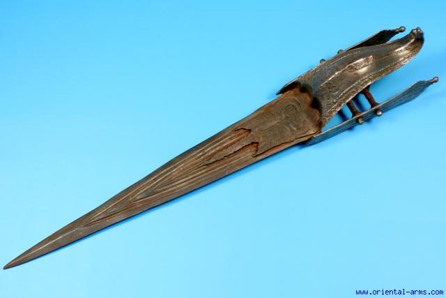 A very old version of the famous Indian Kattar (Katar) push dagger. A development stage between the Pata, the long gauntlet sword and the Kattar, the short push dagger. Early blade, 18 C. or earlier, 16 inches long multifullered. It is riveted to the handle with two reinforcing plates finely chiseled. The handle is protected with a steel hood decorated also finely chiseled and terminating in a styled monster head shaped tip. 22 inches total length. Very good condition. Shallow rust on the inner side of the hood. |