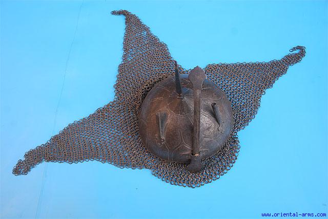 This heavy helmet is Indian, 17 C. from the Deccan region (South central India). Whole steel dome chiseled with interlocking lotus petals, top spike, nasal guard and plume holders. Chain mail and neck guard with riveted steel rings. 7 1/2 inches diameter. Very good condition. Old small repaired area on the dome. A rare find. This rare helmet comes from the Charles Buttin collection of antique arms and armor. See Catalogue de la Collection D'armes Anciennes de Charles Buttin, Plate XX item 627 (Wrongly defined- in our humble opinion- as Circassian helmet). |