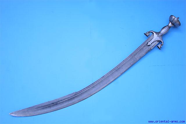 This heavy sword is a Pulwar, the Afghan relative of the Indian Tulwar, characterized by the steel handle with down curving quillons and semispherical pommel cap. This one is a very good example, mid 19 C. with a heavy wide blade 27 inches long and 2 inches wide with 11 inches raised back edge (Yelmen). The blade is forged from very good pattern welded (Damascus) steel and deeply marked with the maker sign near the langet. The whole steel handle is of the classical form with a ribbed pommel. Total length 32 inches. Very good condition. Scratches from old sharpening attempts. No scabbard. |