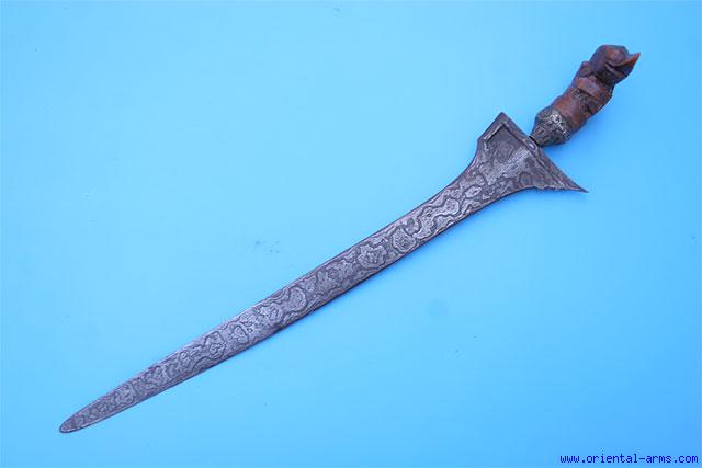 This very good Keris dagger is of Sumatra origin, mid to late 19 C., straight blade 15 1/2 inches long of very clear and unusual pamor pattern. Very finely carved wood handle with silver mendak. Total length 18 1/2 inches. Very good condition. No scabbard.