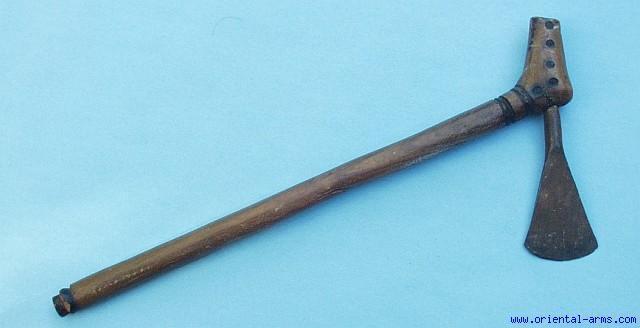 A small fighting axe of the Chokwe people residing in today’s Angola borders. Steel blade 2 inches wide and 4 inches long is mounted on an L shaped wood haft 14 inches long. Simple decoration only. Very good condition.