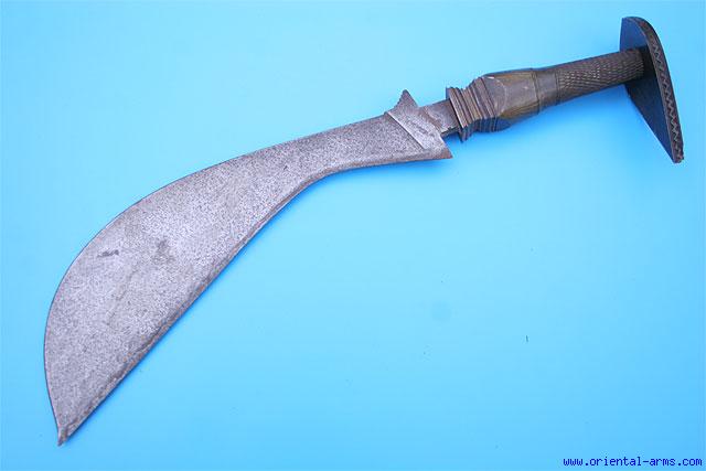 The Ayda Katti is the national sword of the Coorg of Malabar, the South West coastal area of India. It is one of the rarest swords in the Indian arsenal and of a very peculiar shape. It reminds in a way an agricultural tool, but it is a real weapon and a deadly one in the experienced hands. The blade of this one is of a sickle shape 15 inches long and 4 inches wide at its widest point with a massive steel bolster. The handle is carved horn checkered around the grips area, with a kite shaped horn pommel. 21 inches total length. Very good condition. A RARE UNIQUE SWORD. |