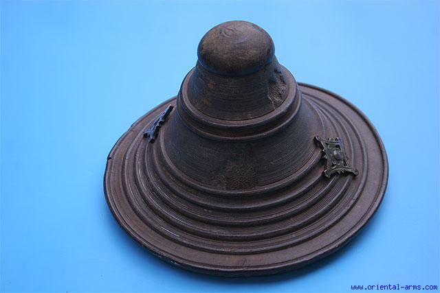 This is a Buckler (hand shield) from the horn of Africa. It is 9 inches in diameter, 6 inches in height, made from a thick hide of the Hippopotamus almost ¾ inches thick . In this thickness it is believed it will stop a bullet from a small caliber pistol. The fittings are brass. Very good condition . Small areas of damage to the hide. These type of shields were sought after in all the area and were traded all the way from Africa through Zanzibar to Oman, therefore they are sometimes defined as Omani Bucklers. |