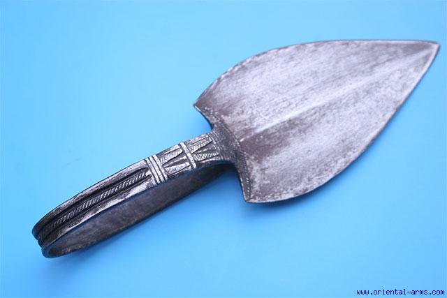 A loop dagger of the TIV people residing on the Niger river in Nigeria. Very typical but unusual whole steel construction with the ring hilt forged in one piece with the blade. Short and wide, leaf shape 5 X 3 inches blade. Flat hollow ground cross section with a central rib. Filed and chiseled ring handle. Total length 8 inches. Very good condition. Quite unusual and very elegant piece. |