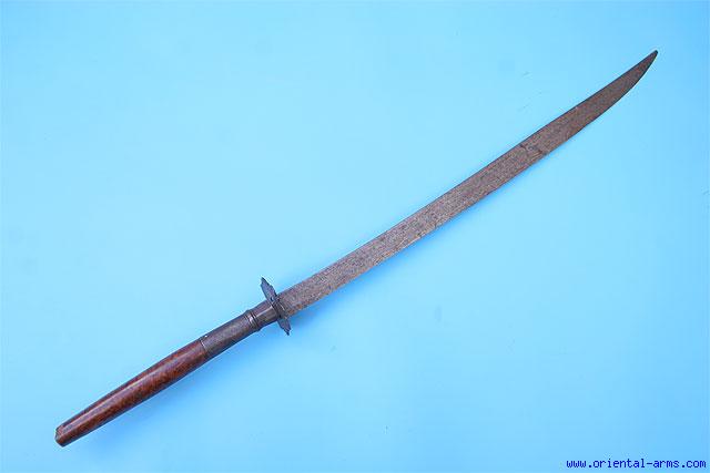 This Dah sword is most probably coming from Cambodia, mid 19 C. Slender blade, laminated, 20 inches long with steel plate cross guard and beautifully grained wood handle. Steel collar on the handle. Total length 28 inches. Very good condition. Small wood chip on the handle. Nicely patinated blade with few forging flaws. The cross guard is slightly loose due to shrink of the wood handle. |