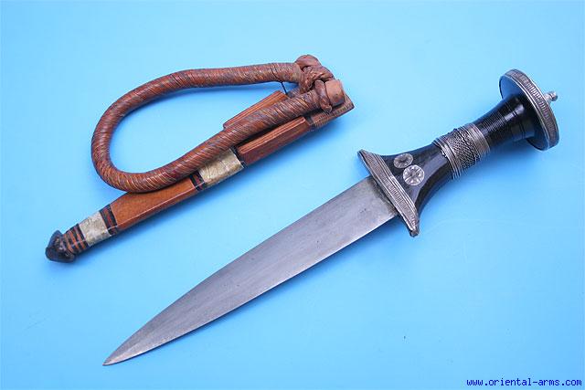 Up for sale is this very good arm dagger from Sudan. 7 inches blade. African black wood grip with finely chased silver mounts bounds with plain and twisted silver wired at the middle of the grip. Tooled leather scabbard with a reptile skin bands and original leather arm band. Total length 12 1/2 inches. Very good plus condition. Light file scratches on the blade. Authentic, mid 20 C. dagger. Very reasonable price. |