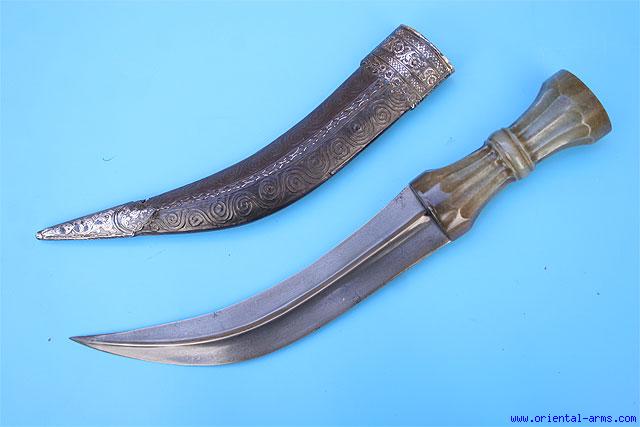 This very fine Jambiya / Khanjar dagger is of Persian origin, but made to order for the Turkish court. Fine double edged curved wootz blade with a central rib, 8 inches long. Fluted Jade handle in the Turkish style. Wood scabbard covered with finely tooled leather and mounted with finely chiseled silver mounts. Total length 13 1/2 inches. Very good plus condition. Very fine and rare dagger. |