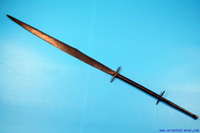 Up for sale is this rare piece. A two handed sword from the Khasi Hills, Assam, Burma. A whole steel construction, with a 28 inches long slender blade, forged together with 22 inches long handle in two sections and two steel cross guards. Total length 40 inches. Very good condition with nice shining age patina. See also W. Egerton, An Illustrated Book of Indian Arms, page 84, Fig. 19, # 204. |