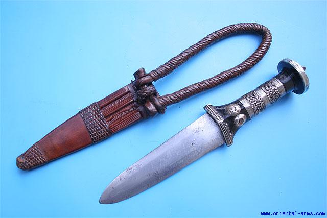 Up for sale is this very good arm dagger from Sudan. 5 inches well made blade. African black wood grip with finely chased silver mounts bounds with plain and twisted silver wired at the middle of the grip. Tooled leather scabbard with a reptile skin bands and original leather arm band. Total length 9 1/2 inches. Very good plus condition. Authentic, mid 20 C. dagger. Very reasonable price.