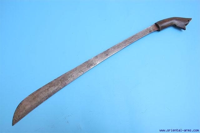 This good and long Klewang is also known in the name of Chunderik and is coming from Sumatra. It is characterized by the long blade, (23 inches long) with a straight edge and down curving spine. Horn hilt. Total length 28 inches. Good condition. Few beatle bites on the handle. Very Low Price. |